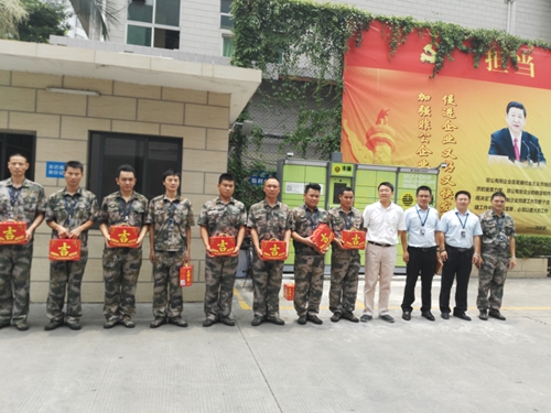 值此8月1日,中國(guó)人民解放軍建軍89周年之時(shí),集團(tuán)總裁趙術(shù)開(kāi)、總裁辦主任范叢明、物業(yè)管理公司副總經(jīng)理何先兵對(duì)公司一線保安們進(jìn)行了“八一”建軍節(jié)走訪慰問(wèn)送