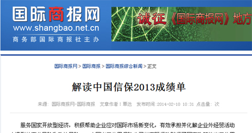 文章原題:解讀中國信保2013成績單 文章地址:www.shangbao.net.cn/epaper/gjsb/254154.html 正文如下: 服務國家開放型經濟,積極幫助企業應對國際市場新變化,有效承